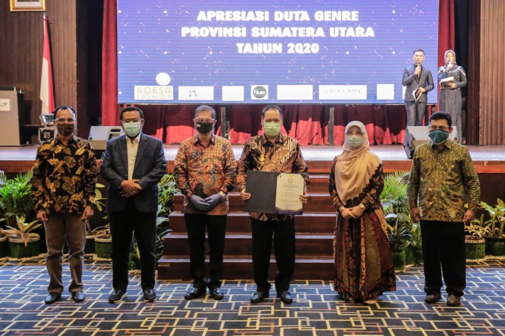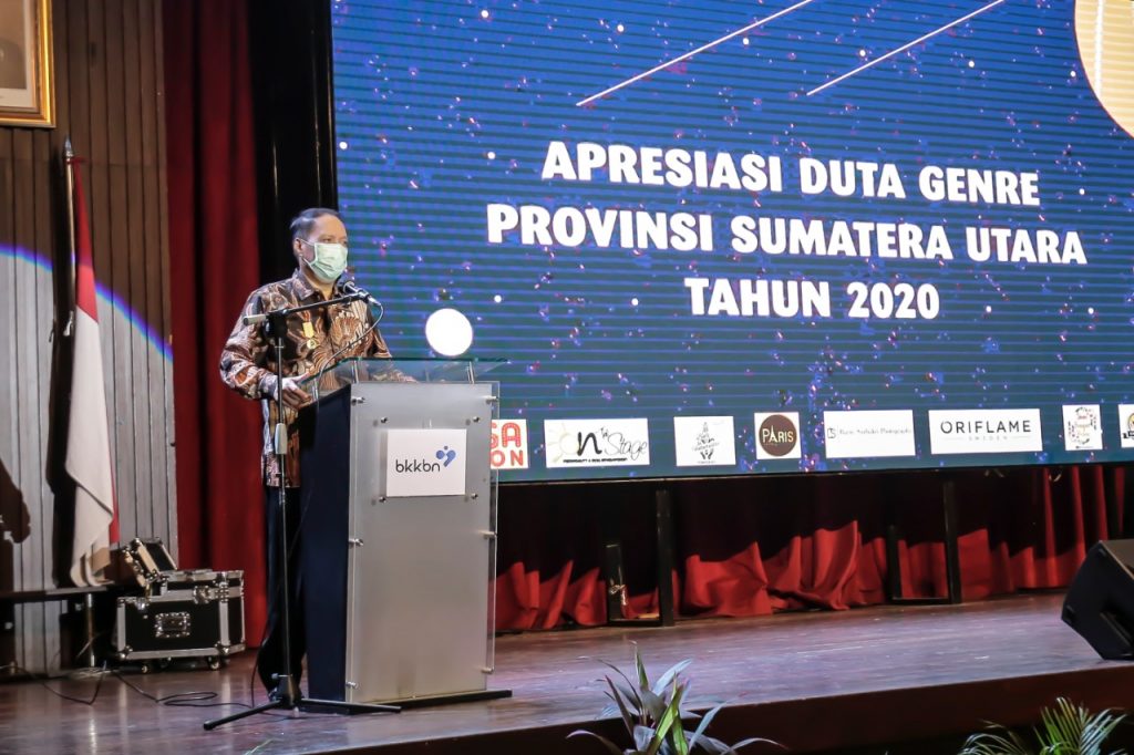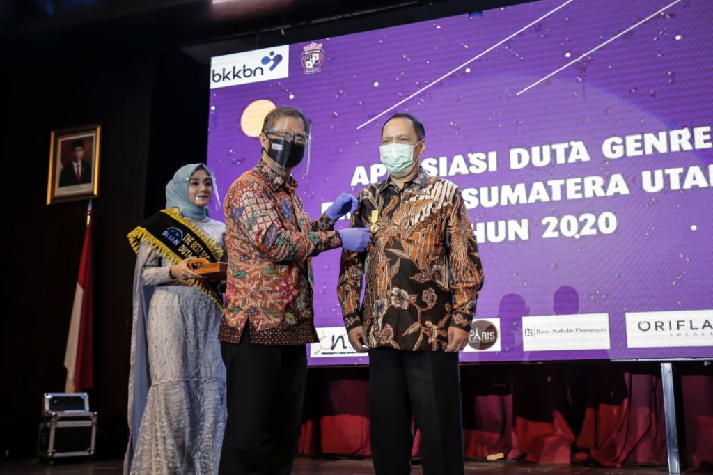 Penghargaan kepada Rektor UMSU diserahkan Kepala Perwakilan Badan Kependudukan dan Keluarga Berencana Nasional (BKKBN) Provinsi Sumatera Utara, Drs Temazaro Zega, M.Kes disela acara Apresiasi Duta Genre Sumut Tahun 2020 di Medan, Sabtu (17/10). Sesuai Surat Keputusan ditandatangani Kepala BKKBN Hastor Wardoyo, penghargaan Dharma Karya Kencana diberikan karena sebagai Rektor UMSU, Dr Agussani, MAP telah memberikan dukungan, tenaga, sarana dan prasarana dalam keberhasilan program pembangunan keluarga, kependudukan dan keluarga berencana untuk terwujudnya keluarga berkualitas dan penduduk tumbuh seimbang.