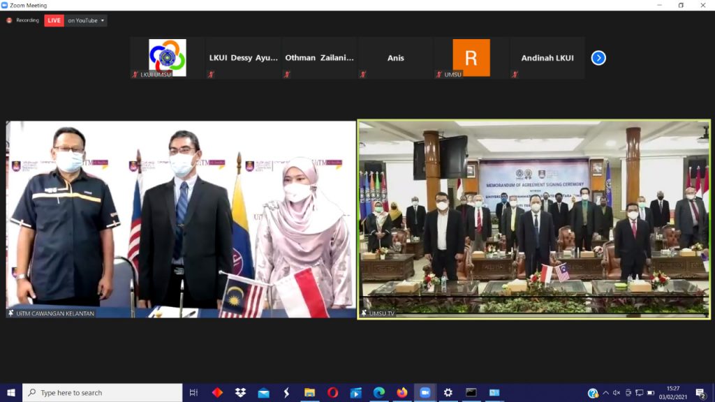 Penandatanganan naskah kerjasama (MoA) dilakukan Rektor UMSU, Dr. Agussani, MAP dan Rektor UiTM Cawang Kelantan, Profesor Madya Dr H Zulkifli Bin Muhammad. Selanjutnya naskah MoA juga ditandatangani Wakil Rektor III UMSU,, Dr Rudianto, MSi dan Assoc. Prof Ts. Dr. Ghazali Osman, deputy rektor, academic affairs dalam acara yang dilaksanakan secara daring di masing-masing kampus, Rabu (3/2).