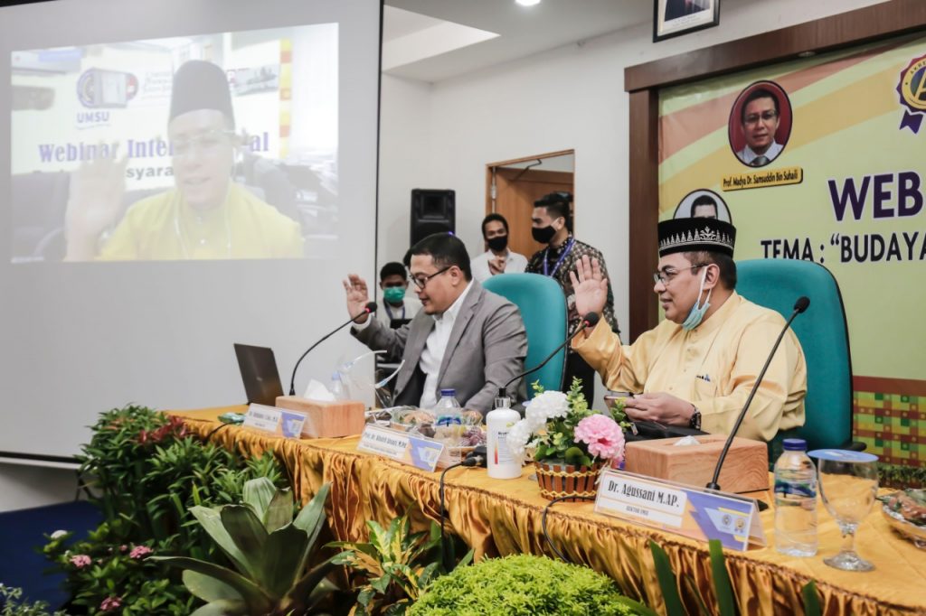 Webinar internasional bertajuk “Budaya Melayu Pada Era Normal Baru menghadirkan narasumber dari UMSU, Universitas Pendidikan Sultan Idris, Malaysia dan Universitas Putra, Malaysia digelar secara daring dan tatap muka terbatas di Kampus Pascasarjana di Jalan Denai, Medan, Selasa (21/7). Acara dibuka Rektor, Dr Agussani, MAP dan dihadiri Anggota Komisi IX, DPR. RI, Prof Djohar Arifin Husin, sejumlah ulama, Ketua MUI, Prof Mohammad Hatta, Syekh Ali Marbun, Buya Amiruddin, MS, KH Zulfikar Hajar, Dr Amhar Nasution, Prof Khairil Ansari, Sakhyan Asmara. Turut hadir pimpinan universitas dari UPSI, Malaysia, Prof. DR. Mohammarof. Dr. Aini Ideris dan Prof. Datuk Mohammad Shatar bin Sabran.